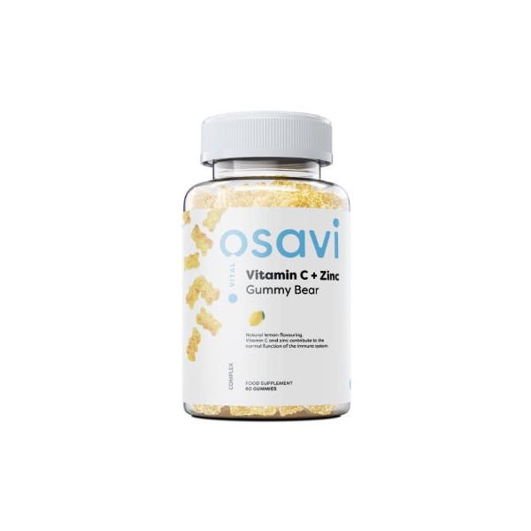 Vitamin C + Zinc Gummy Bear de Osavi es un suplemento de vitamina C y Zinc en forma de deliciosos ositos de gominola sin azúcar y con sabor a naranja, frambuesa y arándanos.