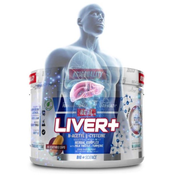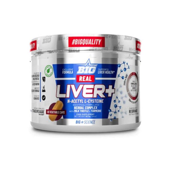 Real Liver+ de Big es un suplemento en cápsulas vegetales que combina una dosis de N-Acetil cisteína con una selección de principios activos naturales específicamente formulados para la protección y correcta regeneración de las células hepáticas, gracias a su alto poder antioxidante y antiinflamatorio, entre los que destacan los extractos de cardo mariano, cúrcuma, algas y pimienta negra.