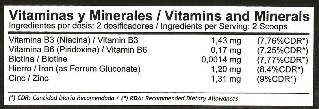 Concentrado de Proteinas Séricas, Monohidrato de Creatina, Glutamina, Triglicéridos de Cadena Media (MCT), aromas, Edulcorantes: Sucralosa, Sacarina Sódica.