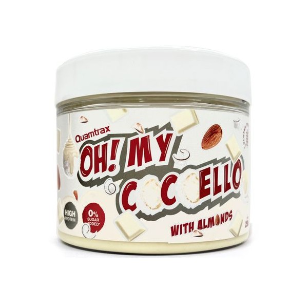 Oh! My Cocoello de Quamtrax Nutrition es una deliciosa crema de coco alta en proteína, sin azúcar añadido, sin sal ni aceite de palma, enriquecida con proteína de suero WPC 80 y con trozos de almendras.