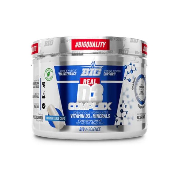 Real D3 Complex de la gama BIGscience es un suplemento en cápsulas que combina la acción conjunta del Boro y la Vitamina D3, reformulado por el Doctor Adrián Díaz Rúa y Carlos Mejías para incluir una combinación de principios activos que amplían y mejoran su acción saludable sobre el organismo, como son el magnesio, el zinc o la vitamina k2.