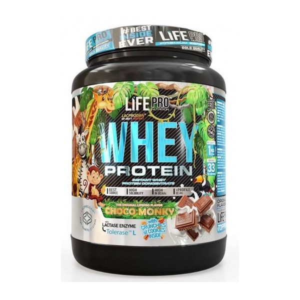 Whey Protein Choco Monky de LifePro Nutrition es un suplemento en polvo que contiene el 100% de concentrado de proteína de suero WPC Lacprodan® SP-8011 Instant, una de las mejores materias primas existentes en el mercado producida por Arla Foods que se ha enriquecido con Tolerase® L para mejorar significativamente la digestión de la lactosa y que ahora podrás disfrutar con el sabor único e innovador choco monky, logrado gracias a la combinación de trocitos de galleta Lotus y cacao alcalinizado.
