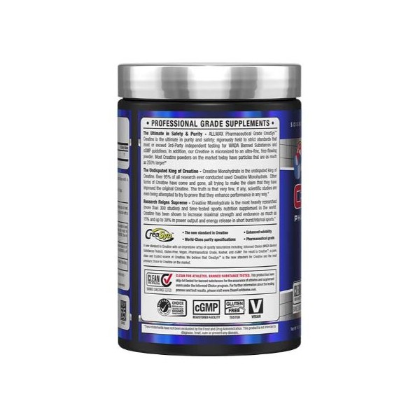 CreaSyn™ es una de las fuentes de creatina más puras, limpias y confiables que puedes encontrar hoy en día. Tiene una impresionante variedad de garantías de calidad entre las que se incluyen; Informed Choice (libre de sustancias prohibidas por la WADA), sin gluten, producto vegano, grado farmacéutico, kosher y cGMP. En Allmax creemos que CreaSyn™ es el nuevo estándar de creatina y la mejor opción que hay disponible ahora mismo en el mercado mundial.