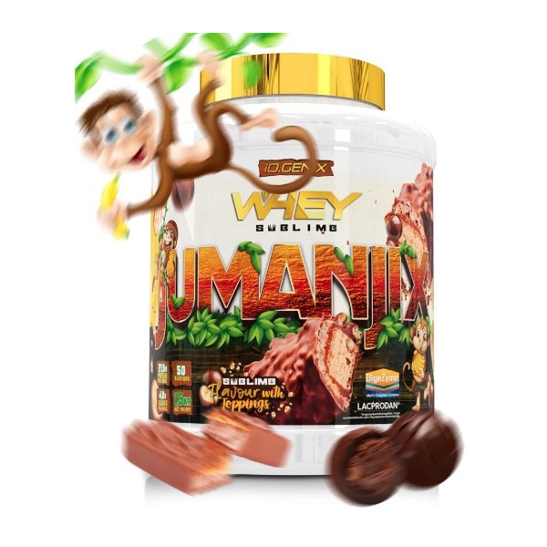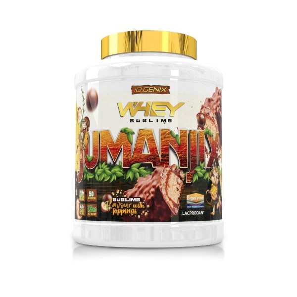 Whey Sublime de IO.Genix es un suplemento en polvo que contiene como materia prima principal concentrado de proteína de suero Lacprodan® de la más alta calidad y un delicioso sabor a plátano y chocolate Jumanjix con trocitos de chocolate y galleta.