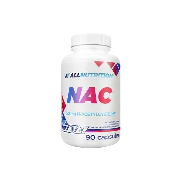 NAC de AllNutrition es un suplemento en cápsulas que proporciona 150 mg de N-Acetil cisteína por dosis de 1 cápsula.