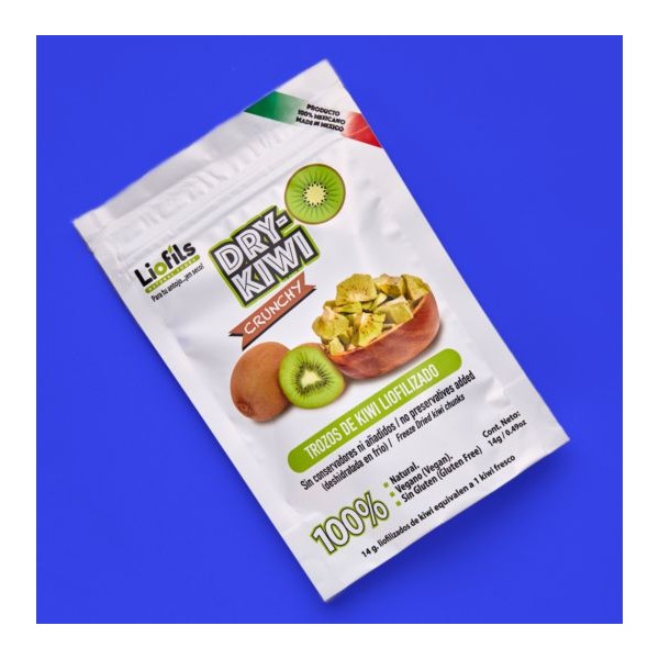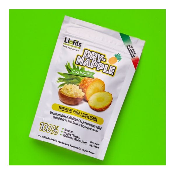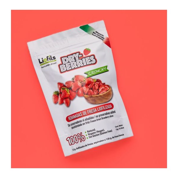Unos 10 gramos de fruta liofilizada equivalen a 100 gramos de fruta fresca, por lo que en cada envase dispones aproximadamente de una pieza de fruta completa.