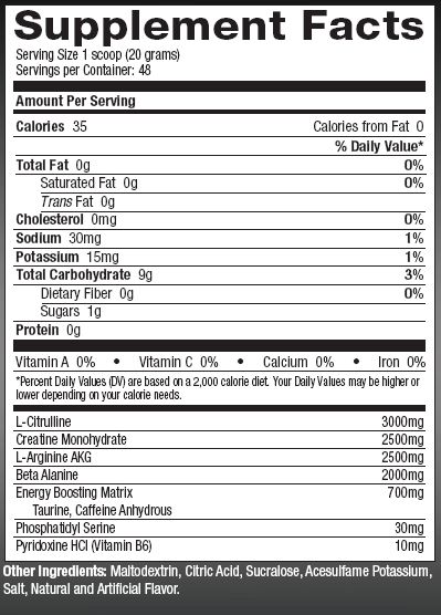 Un estimulante impulso de energía en forma de una gran dosis de cafeína junto con taurina que luchan contra la fatiga muscular permitiendo alcanzar un estado de mayor disposición para comenzar el entrenamiento ofreciendo así una mayor motivación y concentración para enfrentarse a una intensa sesión de trabajo.