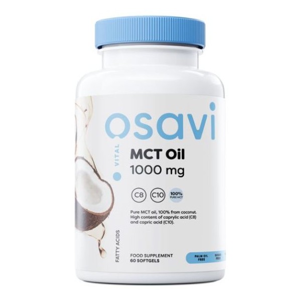 MCT Oil 1000 mg de Osavi es un suplemento en perlas que proporciona 1000 mg de 100% de puro aceite MCT (triglicéridos de cadena media) de coco (Cocos nucifera) con un alto contenido de ácido caprílico C8 y ácido cáprico C10.