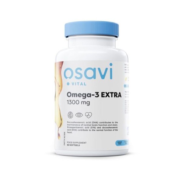 Omega-3 Extra de Osavi es un suplemento en perlas que contiene aceite de pescado altamente concentrado y purificado que contiene ácidos grasos insaturados esenciales (DHA y EPA).