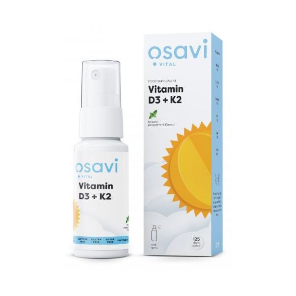 Vitamin D3 + K2 de Osavi es un suplemento en forma de spray para pulverizar directamente en la boca que proporciona 1000 UI de vitamina D3 (como colecalciferol) y 20 mcg de vitamina K2 como menaquinona-7 para ayudarte a mantener tus huesos y articulaciones fuertes y saludables, a la vez que mejoras tu rendimiento cognitivo.