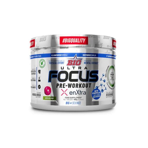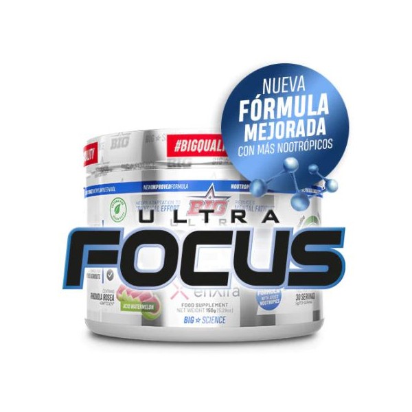 El nuevo Ultra Focus es un suplemento pre-entreno multi-ingrediente basado en el bestseller REAL FOCUS, producto revelación de BIG® desde el 2021, cuya fórmula ha sido ahora ampliada y mejorada con nuevos componentes nootrópicos para obtener una mayor activación y una mejor reducción de la sensación de fatiga durante tus sesiones de entrenamiento.