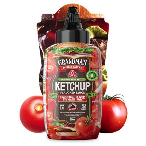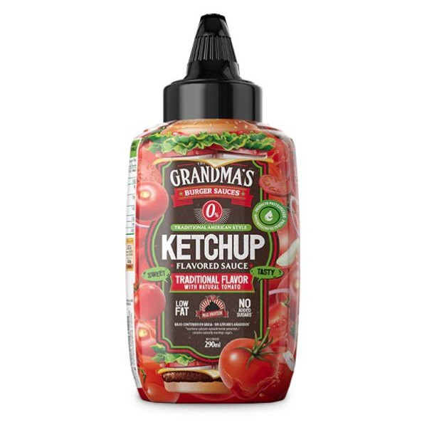 Nuestras salsas Grandma´s están pasteurizadas, lo que garantiza que se mantengan con el mínimo uso de conservantes. Grandma´s Ketchup Traditional Flavor Sauce es baja en grasas e hidratos de carbono. Además, no contiene azúcares. ¡Todo el sabor y textura del kétchup receta americana tradicional, pero con unos MACROS como nunca!