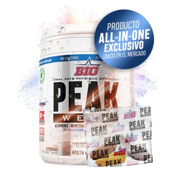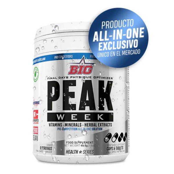 Peak Week de Big Nutrition es un suplemento en cápsulas y tabletas que contiene un nuevo complejo multi-vitamínico y mineral all-in-one para profesionales y competidores que contiene una combinación exclusiva de vitaminas, minerales y extractos de hierbas que optimizan la carga necesaria en los días previos a la competición y favorecen la diuresis natural en los días inmediatamente anteriores a una competición o campeonato, todo en un único producto.