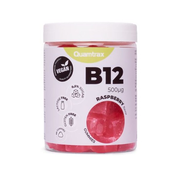 B12 500 mcg de Quamtrax Nutrition es un suplemento que se presenta en forma de deliciosas gominolas con edulcorante y sabor a frambuesa.