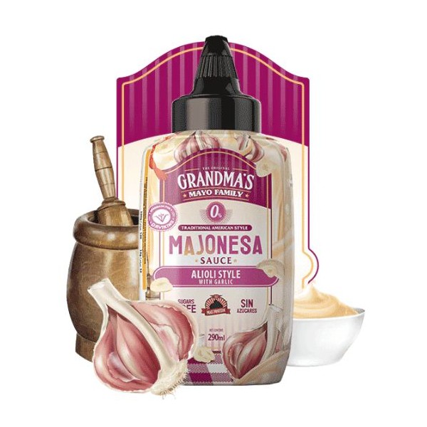Disfruta ahora de la nueva salsa Grandma´s Mayo Majonesa Alioli Style with Garlic, elaborada con ingredientes naturales de la mejor calidad y muy baja en calorías -sólo 14kcal por toma- ya que no contiene azúcares. La combinación perfecta: un sabor y textura mucho mejor que otras marcas, y menos calorías que las mayonesas tradicionales.