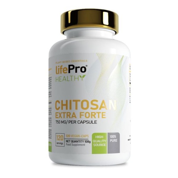 Chitosan Extra Forte de LifePro Nutrition es un suplemento en cápsulas vegetales que proporciona 750 mg de chitosán por dosis de 1 cápsula.