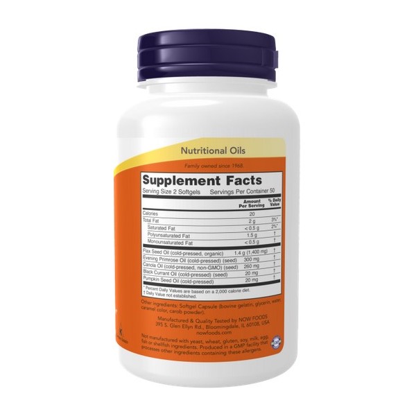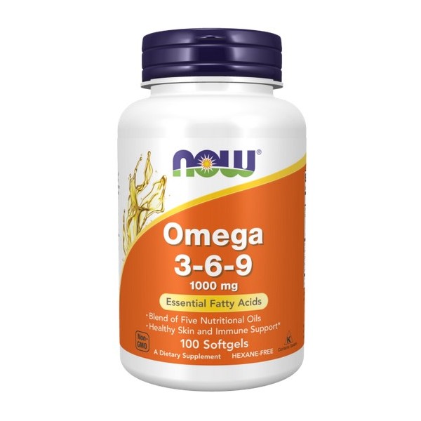 Omega 3-6-9 1000 mg de Now Foods es un suplemento en perlas que proporciona 1.000 mg de una combinación de 5 ácidos grasos esenciales: Omega-3 [ácido alfa linolénico (ALA)] 45%; Omega-6 [ácido linoleico y ácido gamma linolénico (GLA)] 26,5%; Omega-9 [ácido oleico] 17,5%; otros ácidos grasos (ácidos grasos de cadena corta, grasas saturadas, fosfolípidos, etc.) 11%, por perla.