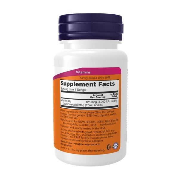 Vitamin D-3 5000 IU de Now Foods es un suplemento en cápsulas que proporciona 125 µg (5000 IU) de vitamina D3 como colecalciferol con gran poder de absorción, una vitamina esencial liposoluble que a menudo se la conoce como “la vitamina del sol“.