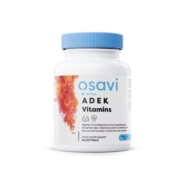 ADEK Vitamins de Osavi es un suplemento en perlas que contiene betacaroteno natural procedente del alga D. salina (provitamina A), vitamina D3 (colecalciferol) de origen natural, vitamina E natural (D-alfa-tocoferol) y vitamina K2 (menaquinona-7) disueltas en aceite MCT de coco.