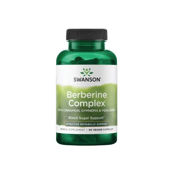 Berberine Complex de Swanson es un suplemento en cápsulas vegetales que contiene una combinación de 150 mg de Berberina HCl con canela, gymnema y fenogreco, diseñado para apoyar la salud cardiovascular y optimizar el metabolismo del azúcar en sangre.