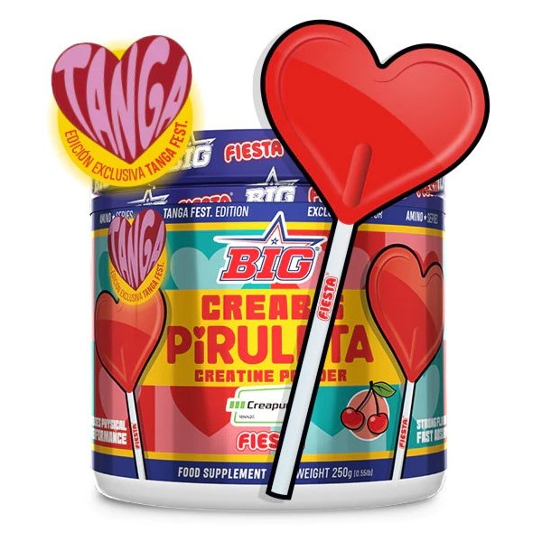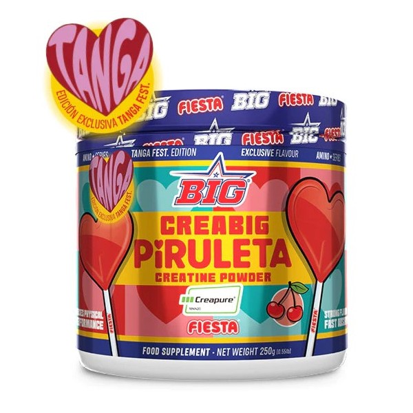 Con motivo de la celebración de la segunda edición del Tanga Festival, el mayor evento fitness y woman lifestyle del verano, Big® presenta en edición limitada a 5000 unidades y en colaboración con Fiesta® un nuevo y exclusivo sabor para nuestro best-seller Creabig. La nueva creatina CreaBig Piruleta Fiesta® es una combinación de la mejor creatina monohidrato disponible en el mercado con la patente Creapure® con el sabor a cereza ácida más genuíno de tu infancia de la auténtica piruleta con forma de corazón Fiesta®.