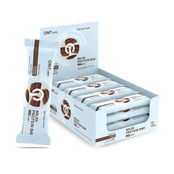 Milkii Protein Bar de QNT son unas deliciosas barritas recubiertas de chocolate con leche altas en proteína y muy bajas en azúcares que podrás disfrutar como un delicioso snack perfectamente equilibrado.