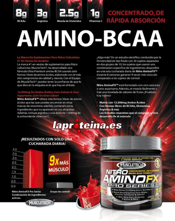 Sin embargo, los BCAA son aminoácidos esenciales, lo que significa que el cuerpo no es capaz de producirlos por sí mismo, sino que necesita conseguirlos de fuentes externas como Nitro Amino FX.