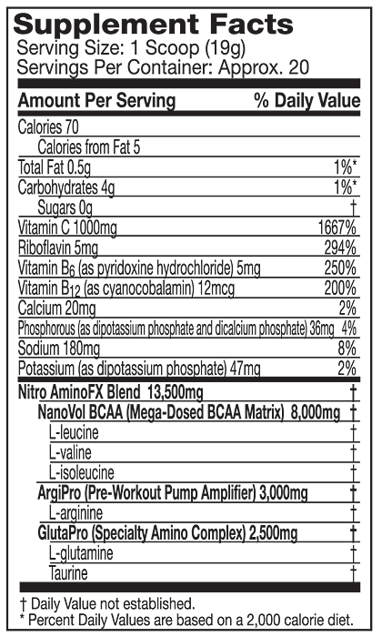 Un solo cacito de Nitro Amino FX proporciona 13500 mg de aminoácidos, incluyendo los BCAA leucina, isoleucina y valina.