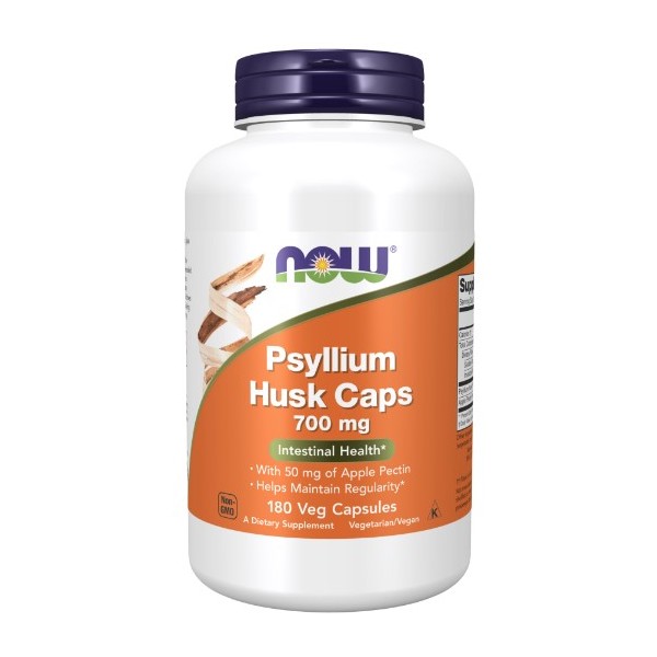 Psyllium Husk Caps 700 mg de Now Foods es un suplemento en cápsulas que proporciona 700 mg de polvo de Psyllium Husk (cáscara/semilla de Plantago ovata) potenciado con 50 mg de pectina de manzana por cápsula, una fuente de fibra soluble que favorece la función intestinal.