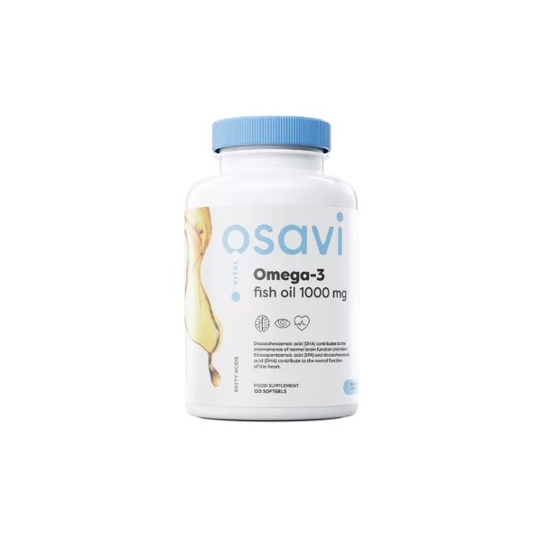 Omega 3 Fish Oil 1000 mg de Osavi es un suplemento en perlas que proporciona 1000 mg de aceite de pescado concentrado y purificado (producido mediante destilación molecular) que contiene ácidos grasos insaturados esenciales (DHA y EPA).