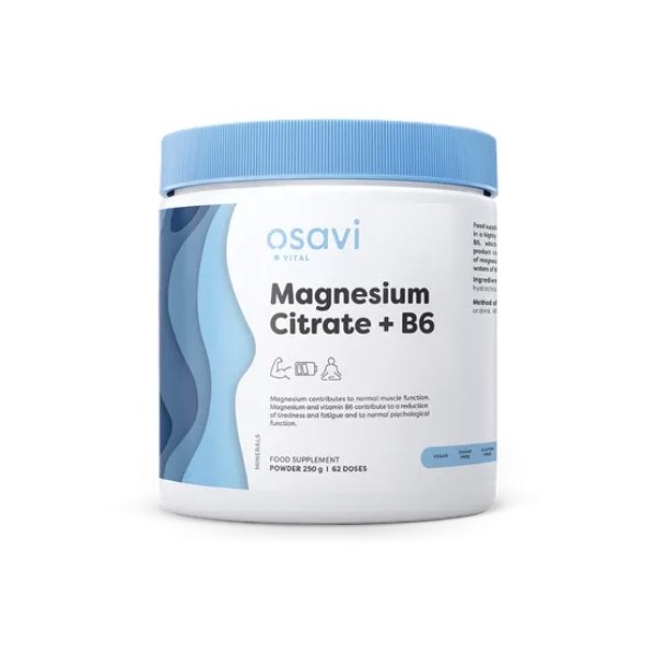 Magnesium Citrate + B6 de Osavi es un suplemento en polvo que contiene magnesio en forma altamente absorbible de citrato de magnesio y vitamina B6, que favorece la absorción de magnesio.