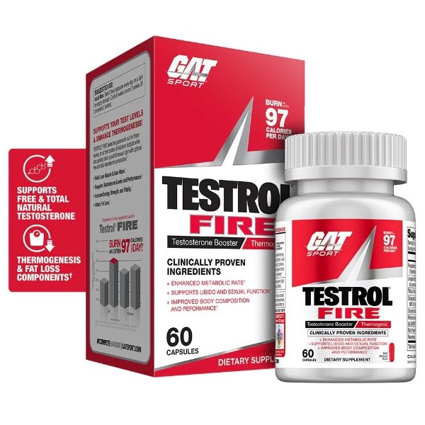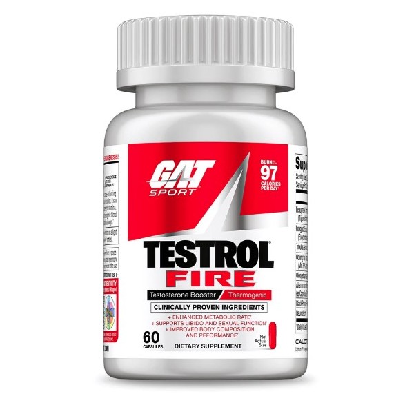 Testrol Fire de GAT™ es un suplemento en cápsulas diseñado para ayudarte a potenciar la producción natural de testosterona para ayudarte a ganar músculo y potenciar tu deseo y potencia sexual, a la vez que te ayuda a quemar grasa gracias a su efecto termogénico.