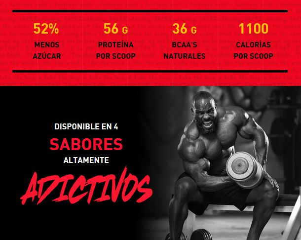 Cada dosis precisa proporciona 1.060 calorías ultradensas creadoras de masa, está diseñado con una mezcla completa de proteínas de alta calidad, en definitiva se trata de una fórmula bioactiva de alto contenido proteico y con unos sabores increíbles.