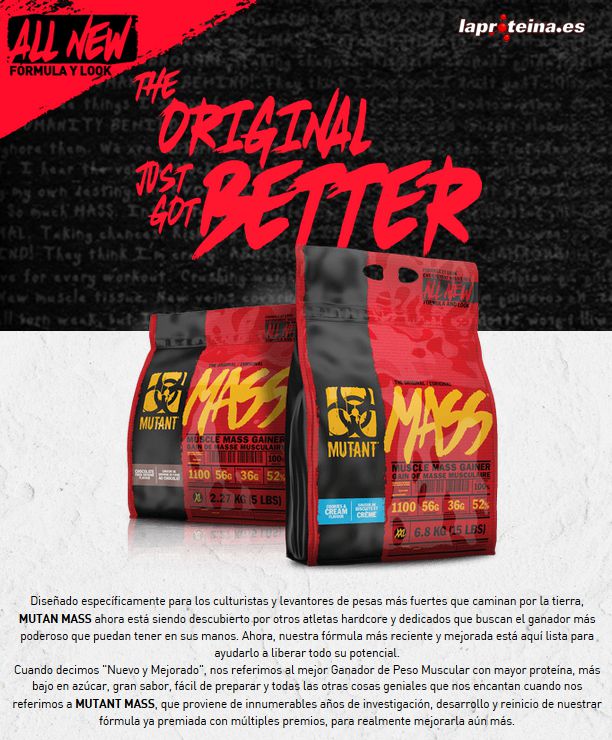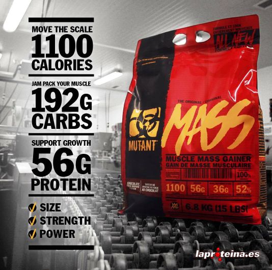 Creado tras incontables horas de investigación y de probarlo en los monstruos de masa más extremos del planeta, Mutant Mass es un ganador de masa muscular secreto y revolucionario que te proporciona unos resultados de construcción muscular extremos, anormales. Si estás destruyendo las pesas del gimnasio para crearte unas proporciones masivas como de MUTANTE, con la piel a punto de rasgarse en los músculos y una fuerza inhumana, entonces Mutant Mass es imprescindible en tu arsenal para construcción muscular.