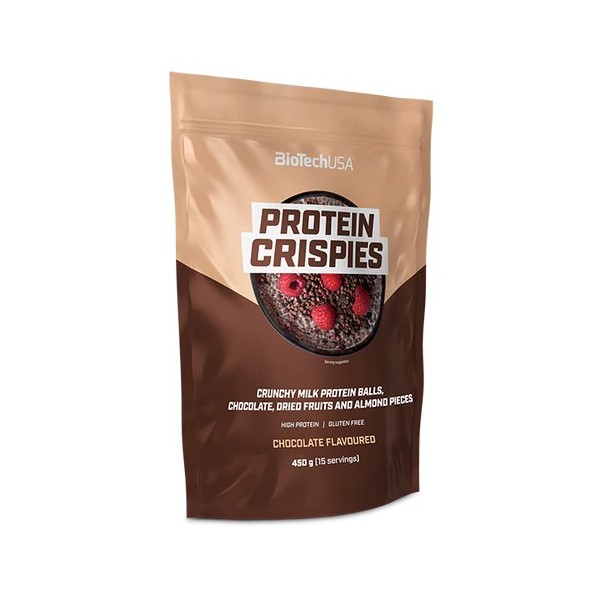 Protein Crispies de Biotech USA es un delicioso alimento alto en proteínas y con un delicioso sabor a chocolate ideal para tomar en el desayuno, que contiene una combinación de bolitas de proteína de leche extrusionada, virutas de chocolate, cacao, trozos de frutas deshidratadas y trocitos de almendras.