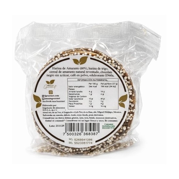 Harina de amaranto (60%), harina de trigo, cereal de amaranto natural reventado, chocolate negro sin azúcar, café en polvo, edulcorante E960a.