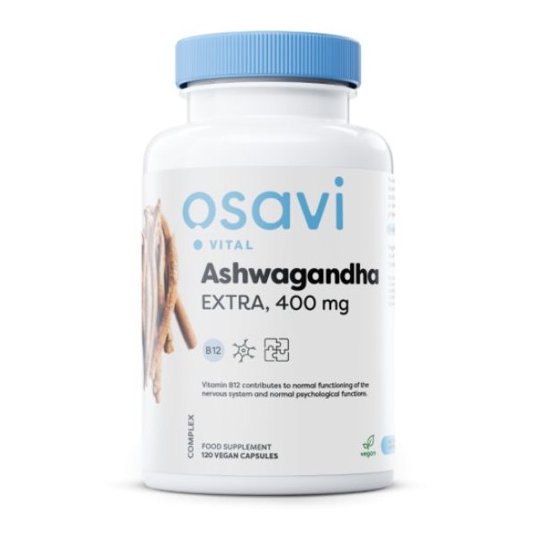 Ashwagandha Extra de Osavi es un suplemento en cápsulas vegetales que proporciona 400 mg de extracto de raíz de Ashwagandha (Withania somnifera) estandarizado para un contenido del 2,5% de withanólidos y enriquecido con vitamina B12.
