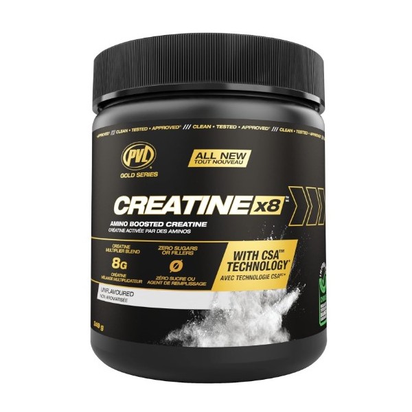 Creatine X8 de PVL Pure Vita Labs es un suplemento en polvo supercargado con 4 gramos de monohidrato de creatina altamente absorbible, potenciado con una matriz sintetizadora de creatina (CSM) con aminoácidos precursores como arginina y metionina.