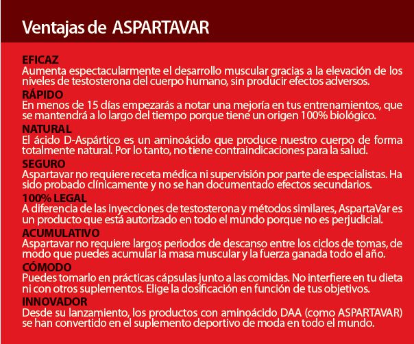 Cuanto mayor sea el nivel de testosterona en el cuerpo, más fácilmente conseguirás aumentar la capacidad natural de tu cuerpo para ganar masa muscular y fuerza. Con Aspartavar te aseguras lograr más músculo y más deprisa, y lo mejor de todo, de una manera totalmente segura, sin efectos secundarios y sin receta médica.