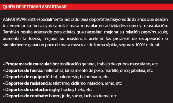 Aspartavar está especialmente indicado para deportistas mayores de 25 años que desean incrementar su fuerza y desarrollar masa muscular en actividades como la musculación.