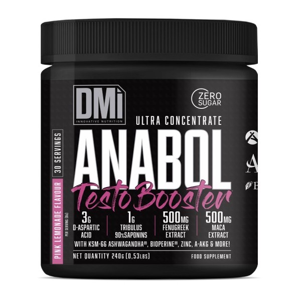 Anabol Testo Booster de DMI Innovative Nutrition es un suplemento en polvo que contiene la fórmula anabólica más completa y revolucionaria del mercado con 3 g de ácido D-aspártico, 1 g de arginina AKG, 1 g de tribulus terrestis 90% saponinas, 500 mg de extracto de fenogreco, 500 mg de extracto de maca, 500 mg de Ashwagandha KSM-66®, zinc, boro, vitamina B6, AstraGin® y BioPerine®.