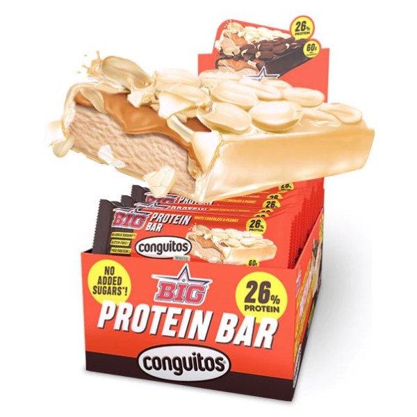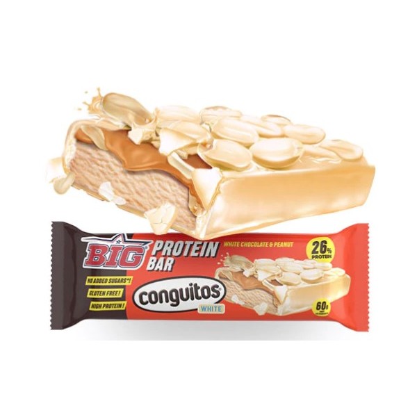 Conguitos Protein Bar de Big Nutrition son unas deliciosas barritas de chocolate blanco y cacahuetes altas en proteínas, elaboradas sin azúcares añadidos y con todo el sabor de los irresistibles conguitos.