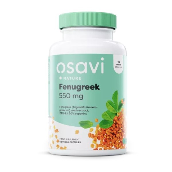 Fenugreek 550 mg de Osavi es un suplemento en cápsulas vegetales que contiene extracto de semillas de fenogreco estandarizado para un contenido mínimo del 20% de saponinas (110 mg de saponinas), que ayuda a mantener un nivel normal de glucosa en sangre y mejora la digestión.