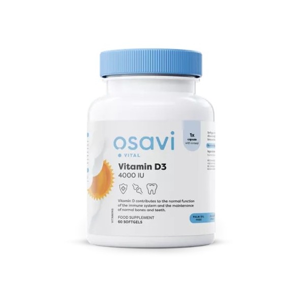 Vitamin D3 4000 IU de Osavi es un suplemento en perlas que contiene 4000 IU de vitamina D3 (colecalciferol) disuelta en aceite MCT de coco.