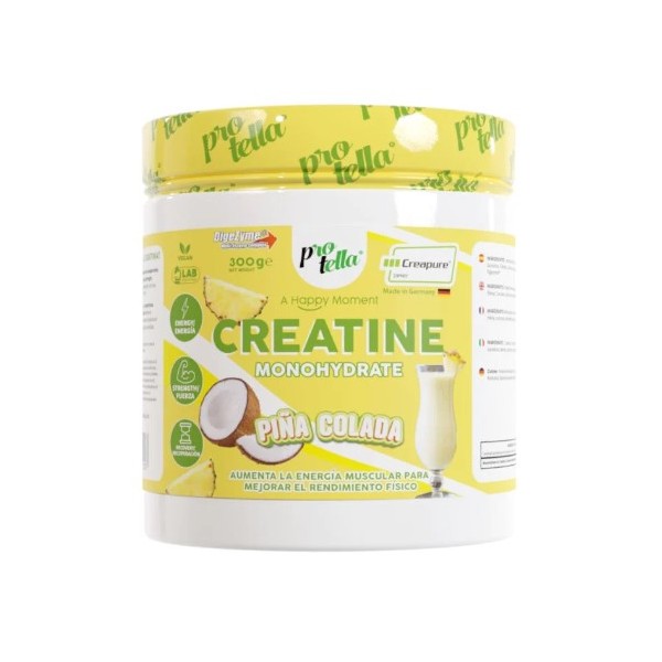 Creatine Creapure Piña Colada de Protella es un suplemento en polvo que contiene el 100% de creatina monohidrato Creapure original de la más alta calidad.