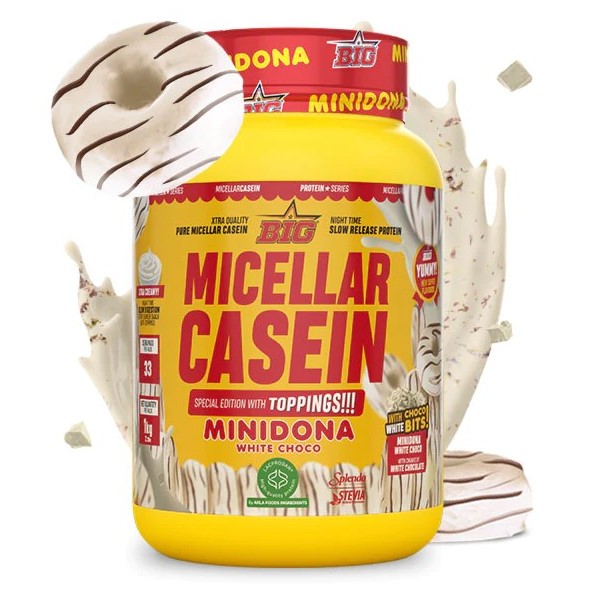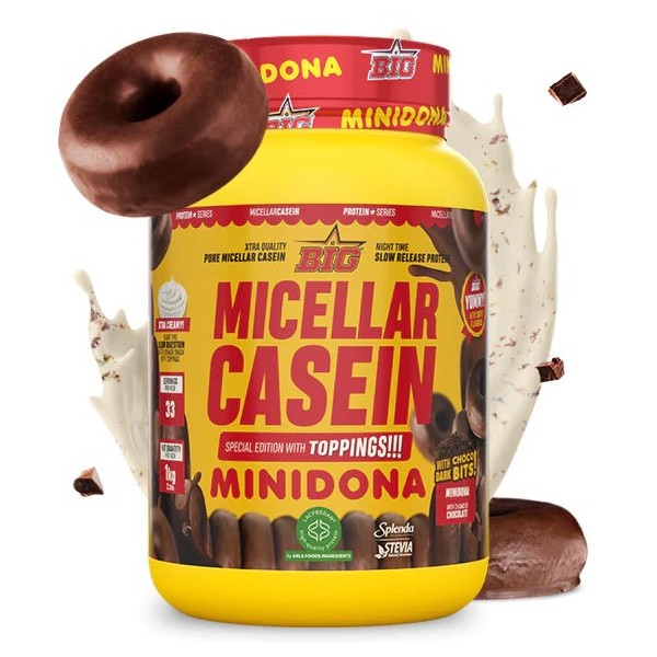 Micellar Casein Minidona with Topping de Big es un suplemento proteico en polvo que contiene una mezcla proteica de lenta digestión y gran calidad especialmente diseñada para utilizar por la noche antes de dormir, compuesta por una combinación de caseína micelar Lacprodan MicelPure® y concentrado de suero de leche Lacprodan® SP-8011V Instant de Arla® Foods Ingredients.