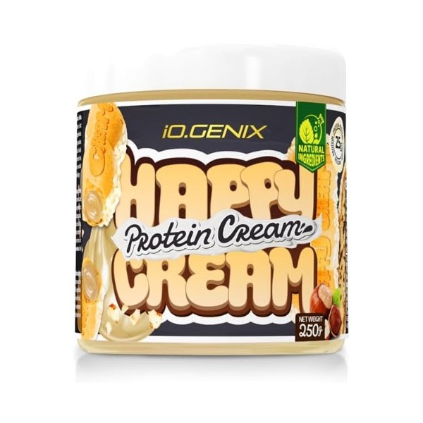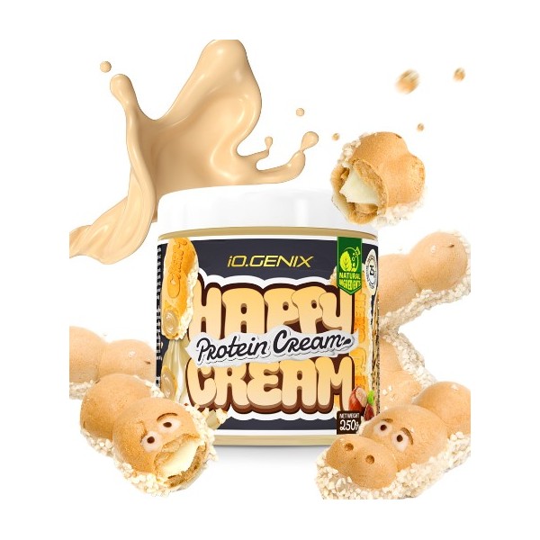 Protein Cream Happy Cream de iO.Genix es una deliciosa crema proteica de chocolate blanco con avellanas elaborada sin azúcares añadidos y mucho más saludable que las cremas de avellana convencionales.