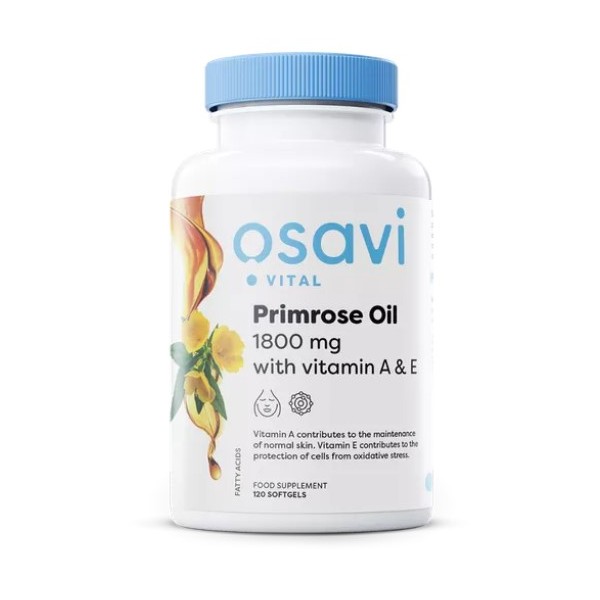 Primrose Oil 1800 mg with Vitamina A & E de Osavi es un suplemento en perlas que proporciona 1800 mg de aceite de onagra prensado en frío estandarizado para el contenido del ácido graso esencial GLA y enriquecido con vitamina A y vitamina E.