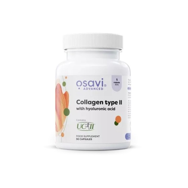 Collagen Type II with Hyaluronic Acid de Osavi es un suplemento en cápsulas que contiene colágeno hidrolizado nativo no desnaturalizado Tipo-II (UC-II®) enriquecido con ácido hialurónico y rosa de mosqueta para el cuidado de articulaciones, huesos y músculos.