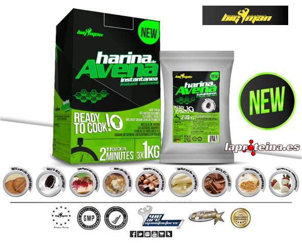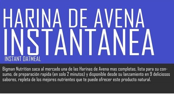 Harina de Avena Instantánea de BigMan contiene harina de avena instantánea con un delicioso sabor a chocolate, chocolate blanco, chocolate blanco con fresas, leche merengada, galleta de chocolate negro, natillas con galletas, chocolate con avellanas, arroz con leche y tarta de queso y fresa.